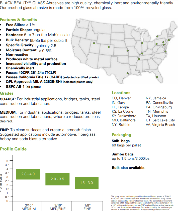 High quality crushed glass abrasive from a company you can trust. BLACK BEAUTY® GLASS abrasives are high quality, chemically inert and contain less than 1% free silica produced from 100% recycled glass. Our crushed glass abrasive is utilized in a wide range of applications. This includes removal of surface coatings such as rust, paint and scale from a variety of substrates, especially stainless steel, aluminum, concrete, brick and wood.