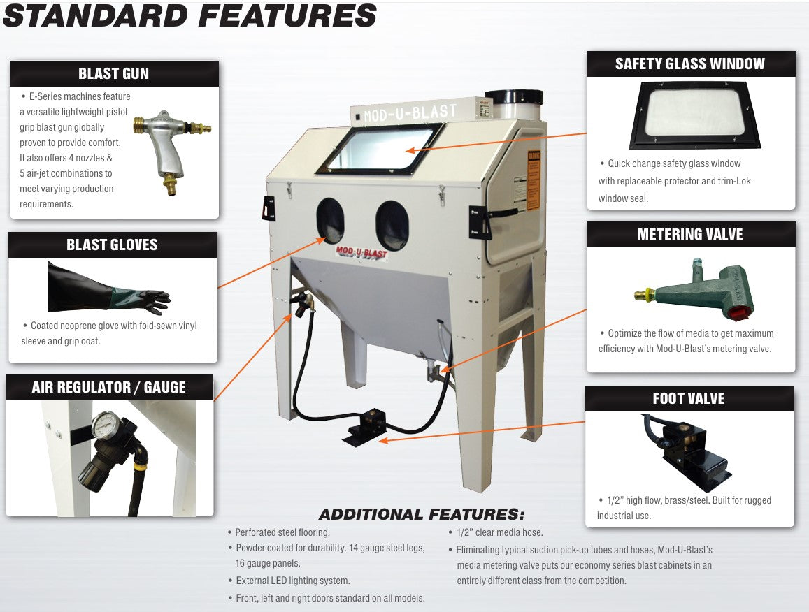 An economical state-of-the-art machine, at a price any shop can afford. E-Series blast cabinets come standard with industrial quality, rugged components typically found only on higher production machines. E-Series blast cabinets are designed for use with glass bead sand can tackle a wide variety of projects. This series is very popular in the automotive industry and any other environment where consistent, professional results are needed with a minimal up-front cost.