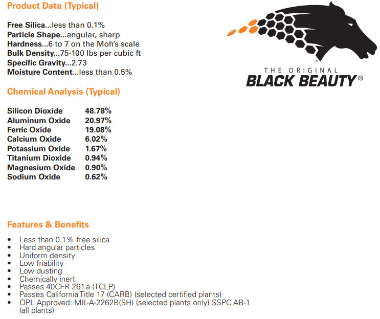 Because we obtain our BLACK BEAUTY® abrasive raw materials from stringent sources as approved and tested by our Technology Center, they meet environmental standards, including the most stringent abrasive specifications in the market. BLACK BEAUTY® passes California Title 17 for low dusting (CARB) (select plants), SSPC AB-1, 40CFR 261.24a (TCLP) and is also military QPL approved at select plants: MIL-A-22262B(SH). Download QPL certification letters HERE. SDS HERE